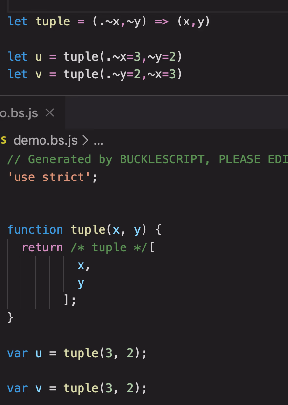 let add = (. x, y ) => x + y; let u = add (.1, 2,3)